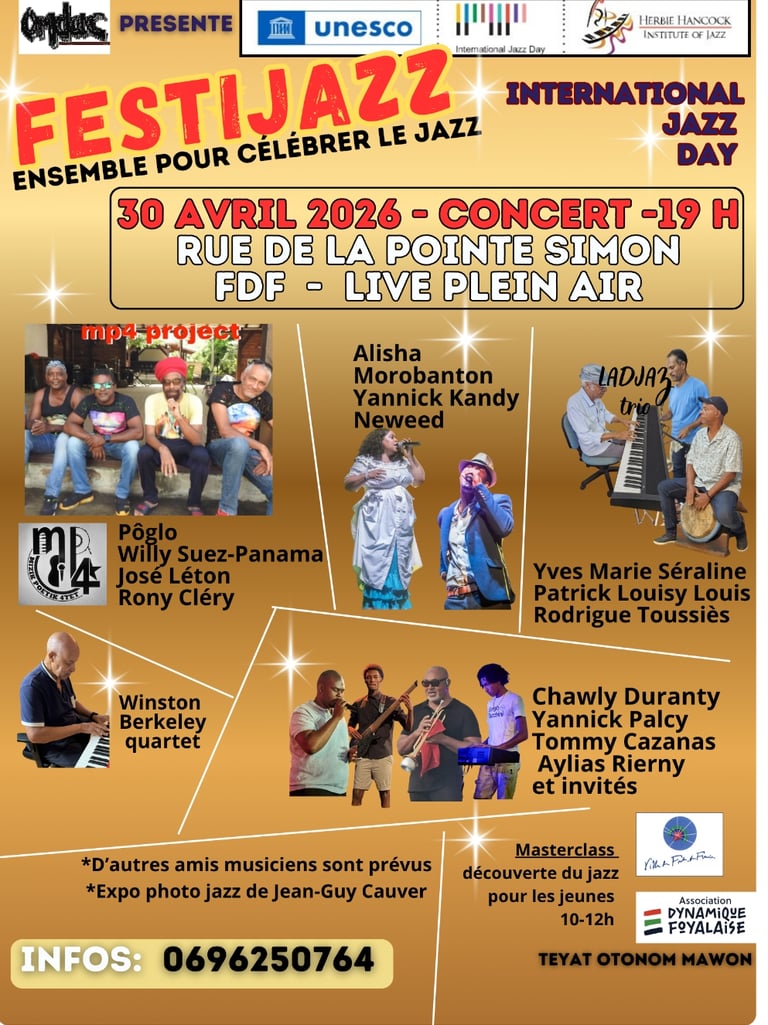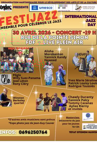 Après 2025, L’OMDAC propose FESTIJAZZ en Martinique pour le INTERNATIONAL JAZZ DAY 2026 . Plusieurs générations de musiciens se retrouveront sur la scène à Fort-de-France, rue de la Pointe Simon. Solistes, duo, trio, quartet, poètes, instrumentistes, vocalistes partageront ce grand moment.
